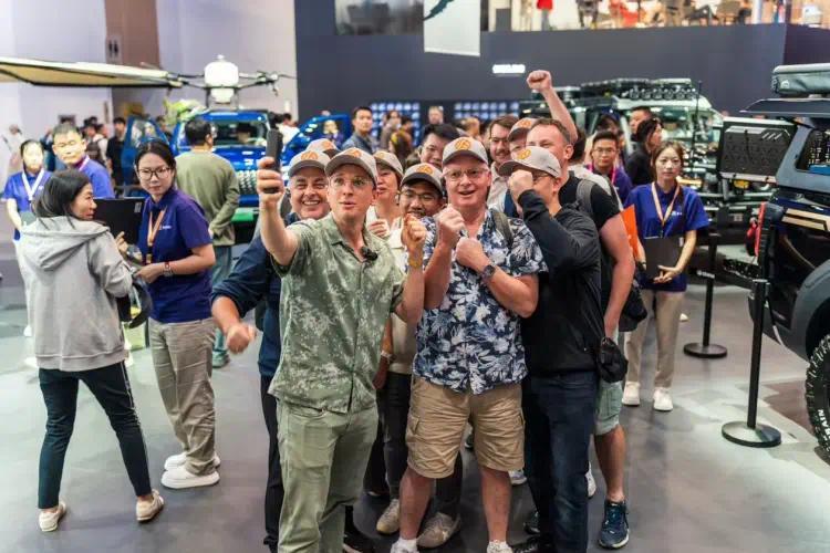 罗伯逊带领外国参观者在2026北京车展上合影留念。 (“车轮哥Wheelsboy”哔哩哔哩平台账号)